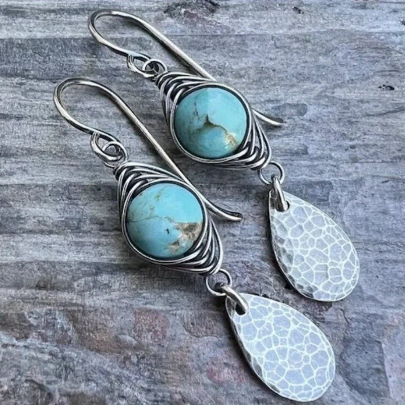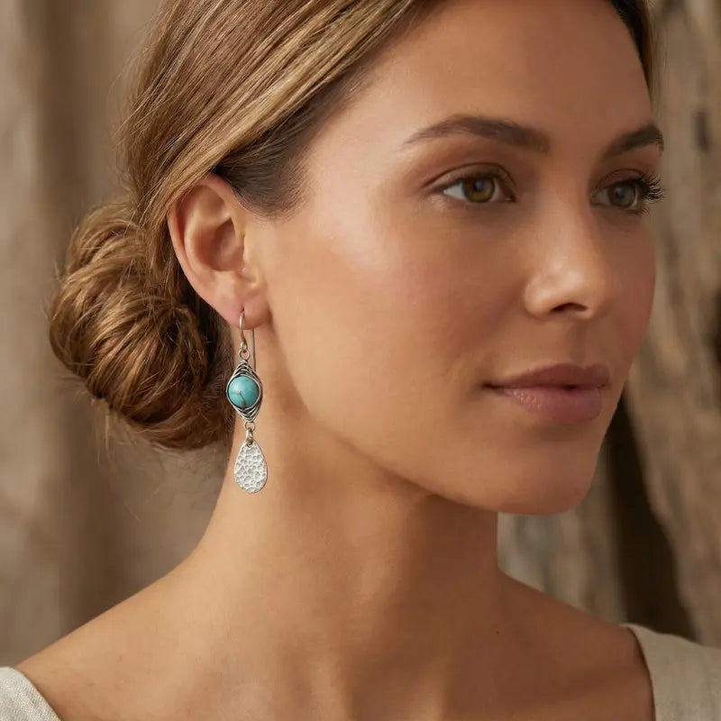 Estos aros capturan ese encanto “artesanal” que se siente único: una piedra de apariencia turquesa envuelta en líneas metálicas, rematada con una gota texturada que se mueve con cada gesto. El resultado es elegante y con personalidad: perfecto para elevar un look neutro, linos, denim, vestidos fluidos o prendas en tonos tierra.